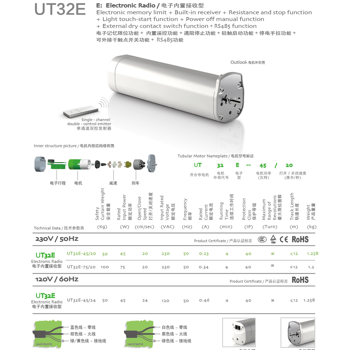 电子记忆限位功能+内置遥控功能+遇阻停止功能+轻触启动功能+停电手拉功能+第三行程点功能+可外接干触点开关功能